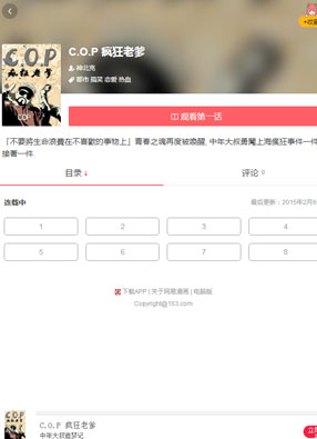 简介:《C.O.P 疯狂老爹》漫画简述:年轻的时候也曾经想过要将生命奉献在音乐上,可是,过了那段年轻的时光,无情的岁月让他们只能无奈放弃自己的梦想。随着时光一天天的的流逝,人到中年,却越发开始感觉梦想的可贵,没有梦想的人生,犹如行尸走肉一般。于是,在好友离世的刺激之下,中年大叔再次拾起过去的梦想,开始向着梦想前进!
